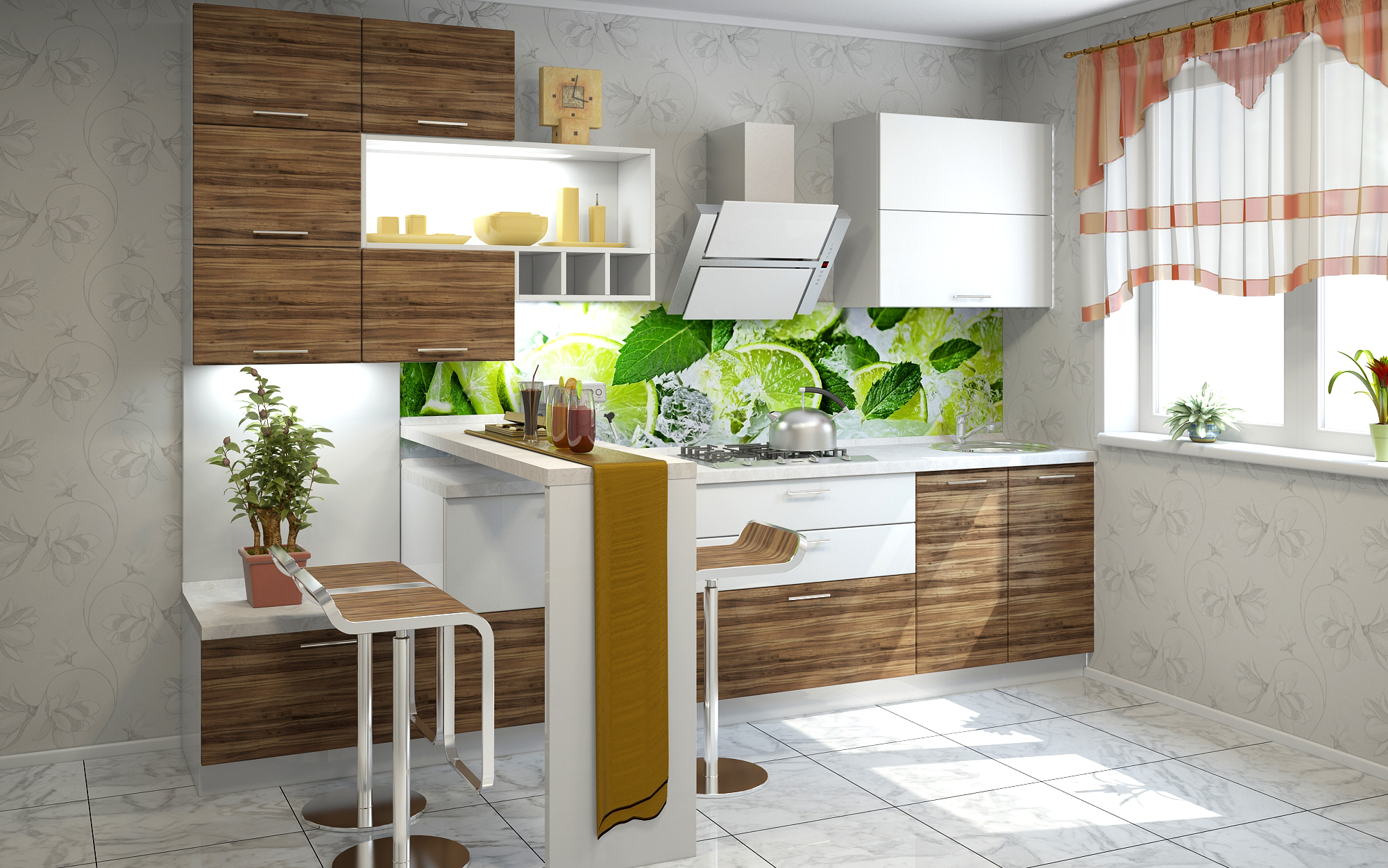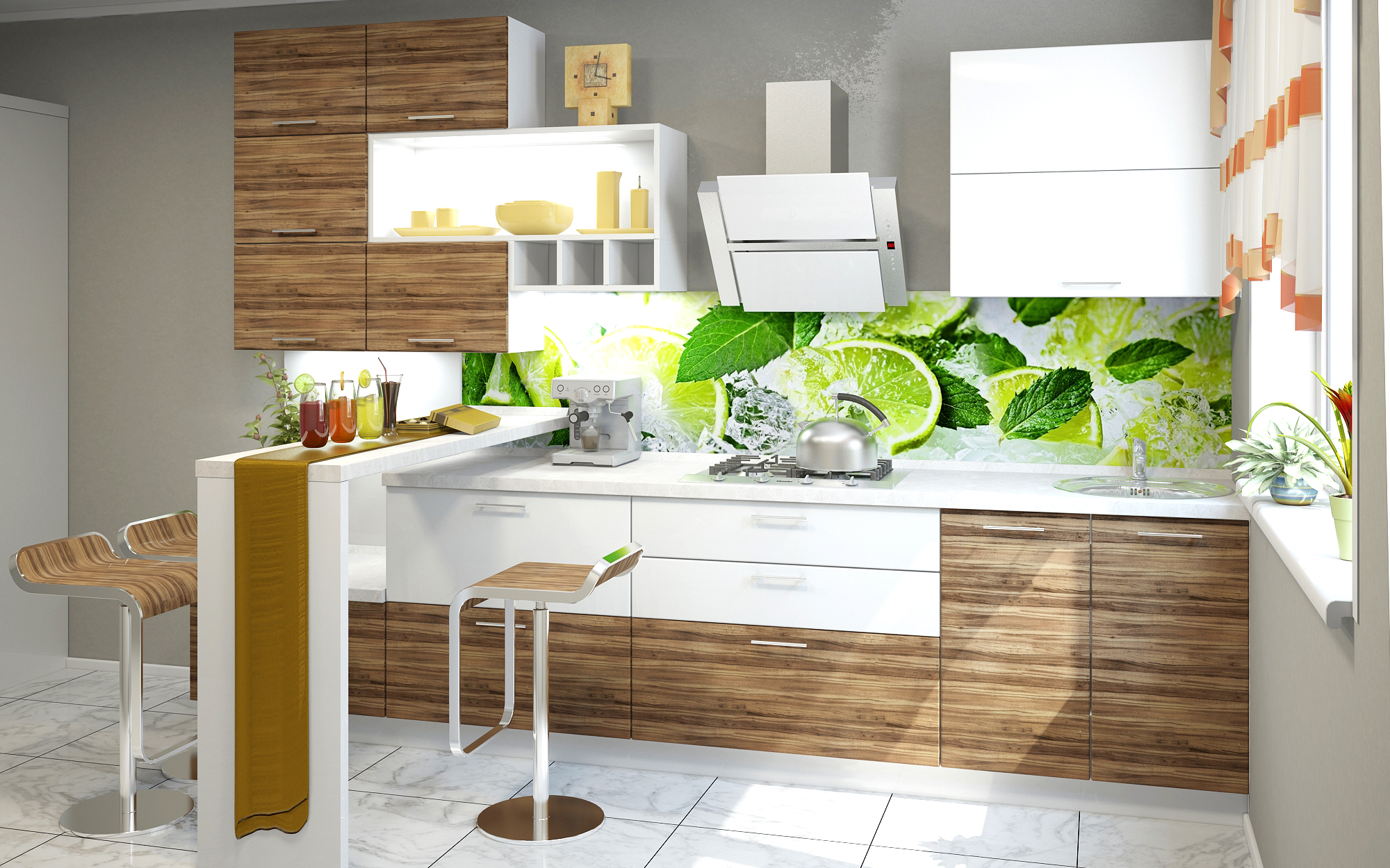 Фурнитура: шкаф с 3 ящиками - тандембокс Hettich; шкаф с 2 ящиками - метабокс с доводчиком; верхние шкафы - подъемный механизм Aventos HK.