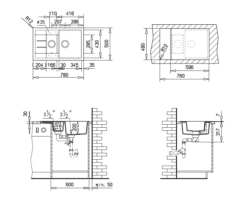 - Реверсивная мойка из Тегранита Плюс; 10 мм